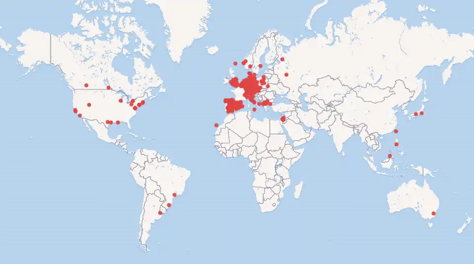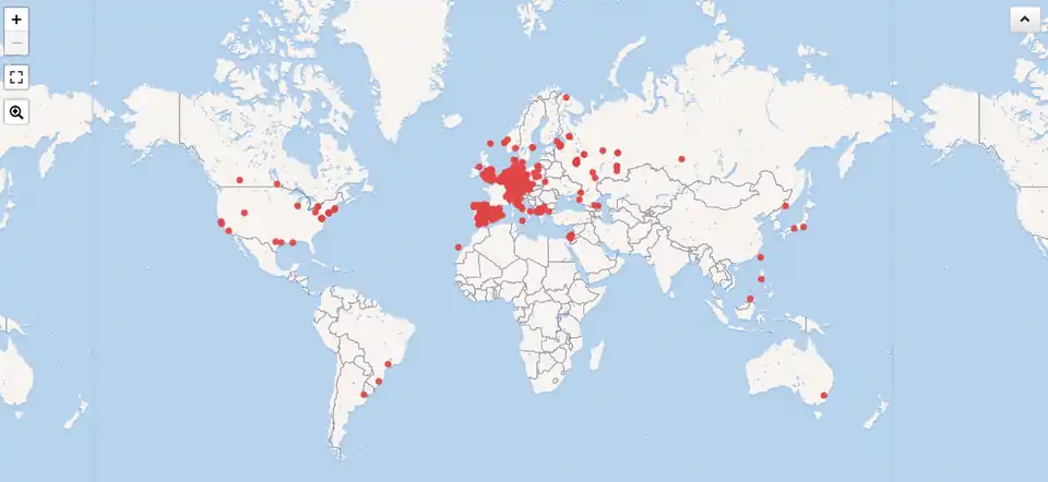 Let's show the geographic location of archives on the world map based on the "location" property, determine the geographic coordinates of the archives and put the archives on the world map.