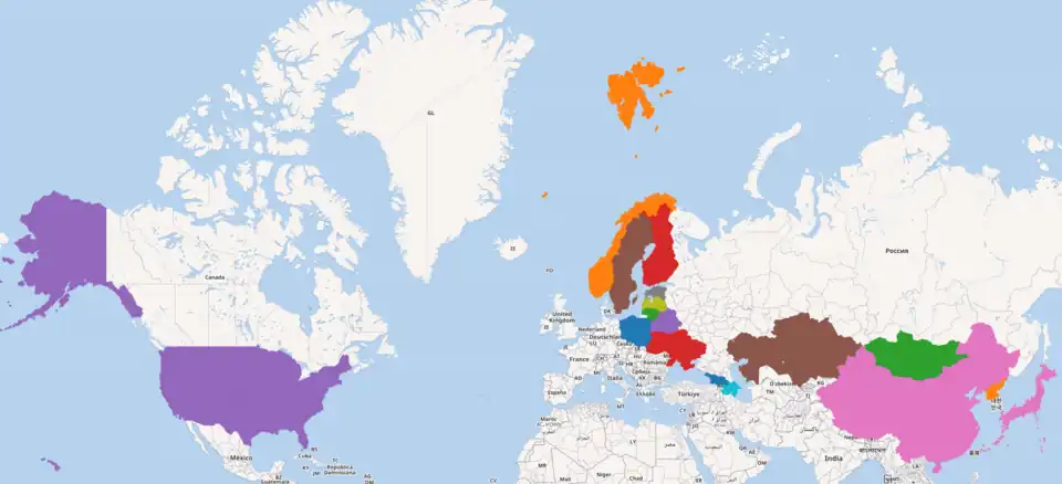 As a result of the query execution, we get a map of neighboring countries of Russia, including 17 countries, namely: Japan, Norway, USA, Finland, Sweden, Poland, Lithuania, People's Republic of China, Belarus, Estonia, Latvia, Ukraine, Azerbaijan, Georgia, Kazakhstan, DPRK and Mongolia.