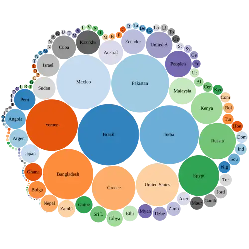 The bubble diagram above shows countries by the total number of people in "human settlement". The diagram and query show that the biggest number of the population live in the "human settlement" in such countries as Brazil (12 million), Pakistan (10 million), Mexico (8 million), Yemen (8 million), India (7 million), Bangladesh (7 million). These countries have climatic and geographic conditions for comfortable living in human settlement.