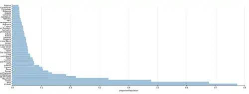 SELECT ?country ?countryLabel (SUM(?population / ?pop) as ?proportionPopulation) (?proportionPopulation * 100 as ?percentPopulation)