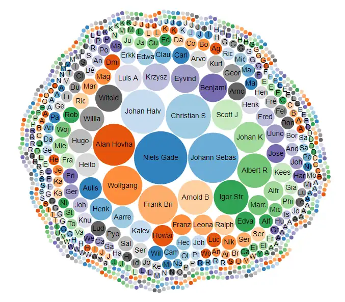 Size of a bubble tells us about the amount of musical compositions. This diagram shows us that some composers have more compositions that the others. Top 5 includes Niels Gade (173 compositions), Johann Sebastian Bach (155 compositions), Christian Sinding (125 compositions), Johan Halvorsen (121 compositions), Alan Hovhaness (108 compositions).