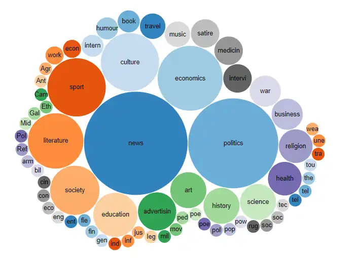 Let us construct a bubble diagram according to the "genre" property from the newspapers of the whole world on the Wikidata.