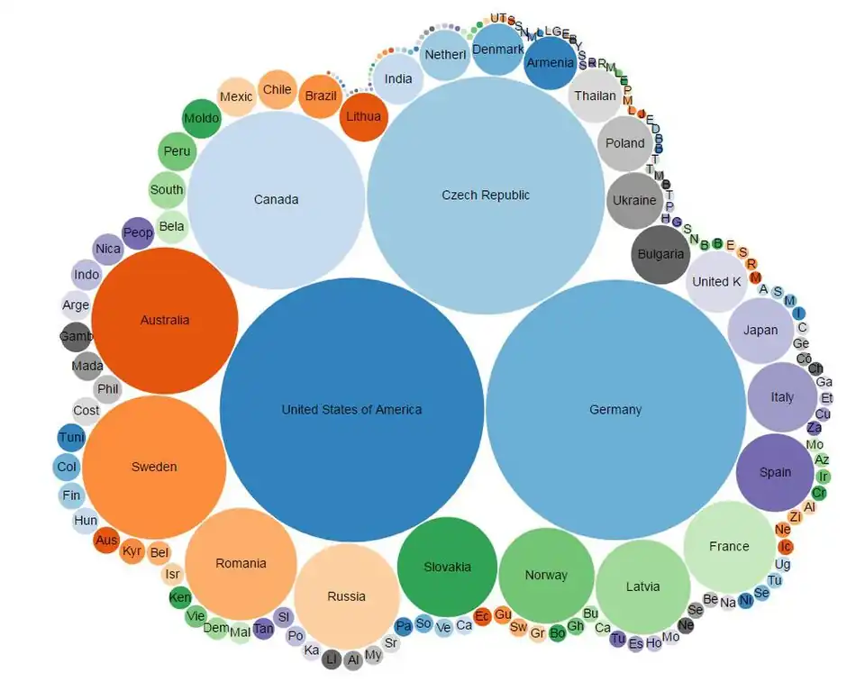 Let's show the ratio of the number of nature protected areas in different countries of the world using a bubble diagram.