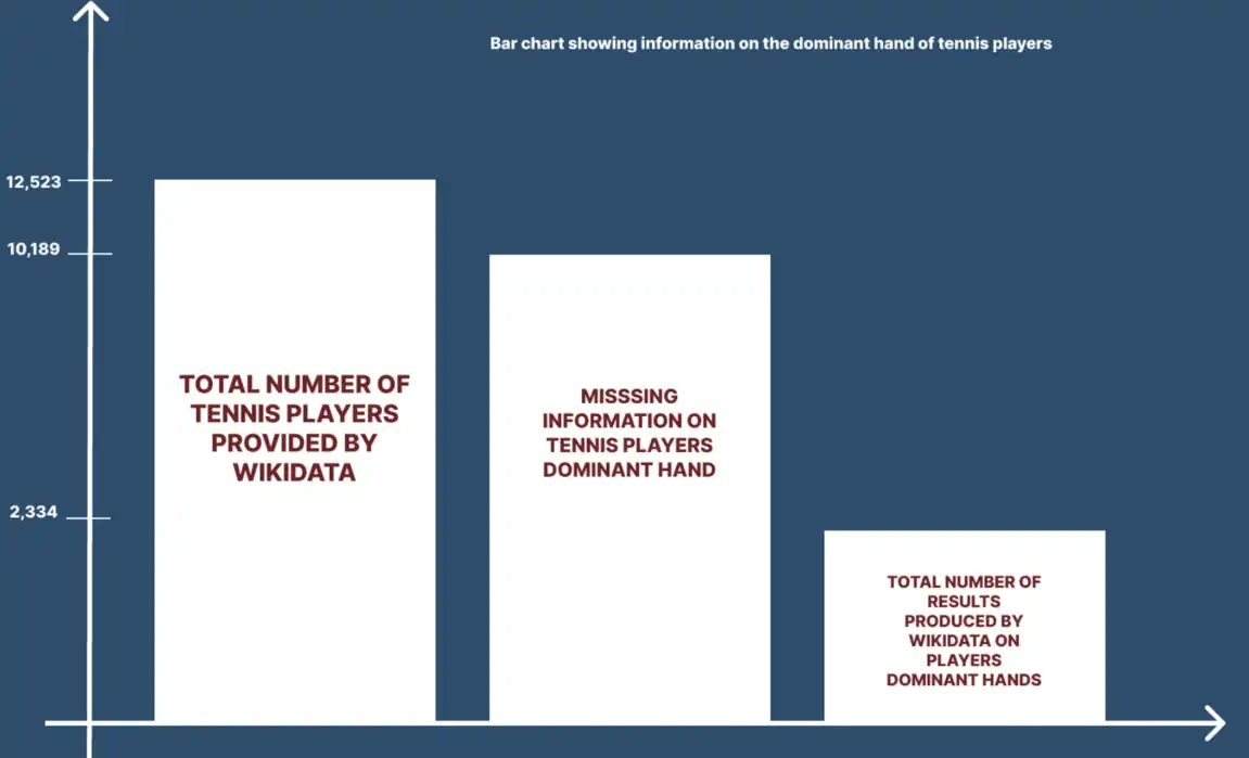 We discovered that Wikidata has limited data about the dominant hands of tennis players. To confirm this discovery I made a Query to list all Tennis players and it produced 12,523 results meanwhile total of all elements in the ven diagram and SPARQL Query above is 2,334 results. It means that Wikidata doesn't have sufficient data about 10,189 tennis players.