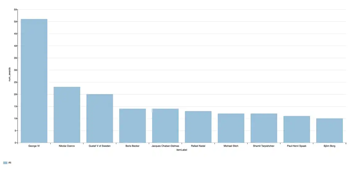 We will make use of SPARQL to Rank the number of awards received by the Top ten male tennis players using a Bar chart.In this query there are two properties occupation (P106) and P21 (sex or gender) with a matching data type or value of tennis player (Q10833314) respectively. We then make use of ?num_awards to also list the number of awards received along side the item label. We notice that the results are scattered and need to be arranged . We make use of the statement ORDER BY DESC(?num_awards),we also use the limit of 10 to limit the number of results listed because we only want to show the top ten male tennis players with the highest number of awards.