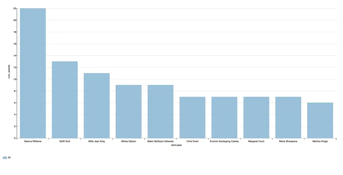 Above it is clear that Serena has the highest career awards followed by Steffi. The above was made using SPARQL bar chart and the image above is a screenshot of the results.