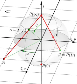 Stereographic projection of complex numbers and onto the points and of the Riemann sphere - connect with A or B by a line and determine the intersection with the sphere.