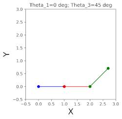 This example presents a slightly other way of solving the above problem. The position kinematics equations of this manipulator can be easily derived using the technique presented in the Serial Manipulator Position Kinematics section, or graphically from looking at the figure above:
