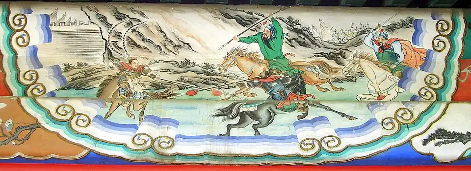 Chapter Five: A forged imperial edict is issued: all towns respond to Lord Cao; Breaking through the soldiers at the pass: the three heroes (Liu Bei, Guan Yu and Zhang Fei) battle Lü Bu.