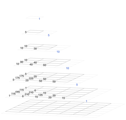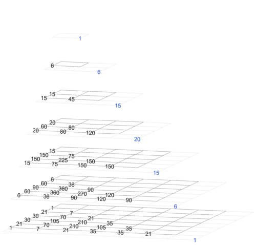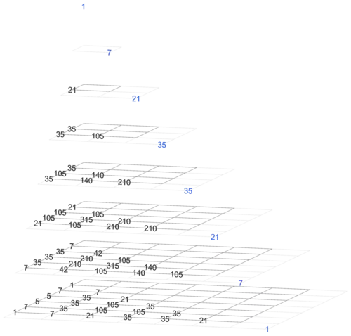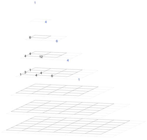 There are many ways to represent these hyperpyramids as series of pyramids. Three are chosen, and shown below for Wisteria.