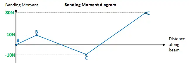 Finally, plot the points on the bending moment diagram. Join all the points up, EXCEPT those that are under the uniformly distributed load (UDL), which are points B,C and D. As seen below, you need to draw a curve between these points. Unless requested, I will not explain why this happens.