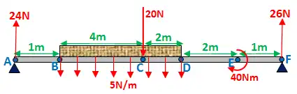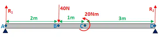 Point moments are something that you may not have come across before. Below, a point moment of 20Nm is exerted at point C. Work out the reaction of A and D: