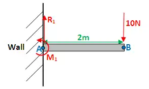 Until now, you may have only dealt with "simply supported beams" (like in the diagram above), where a beam is supported by 2 pivots at either end. Below is a cantilever beam, which means - a beam that rigidly attached to a wall. Just like a pivot, the wall is capable of exerting an upwards reaction force R1 on the beam. However it is also capable of exerting a point moment M1 on the beam.