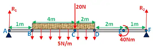 Below is a brick lying on a beam. The weight of the brick is uniformly distributed on the beam (shown in diagram A). The brick has a weight of 5N per meter of brick (5N/m). Since the brick is 6 meters long the total weight of the brick is 30N. This is shown in diagram B. Diagram B is a simplification of diagram A. As you will see, you will need to be able to convert a type A diagram to a type B.