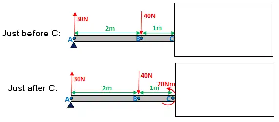 Just after: bending moment at C = 3·30 - 1·40 - 20 = 30Nm
