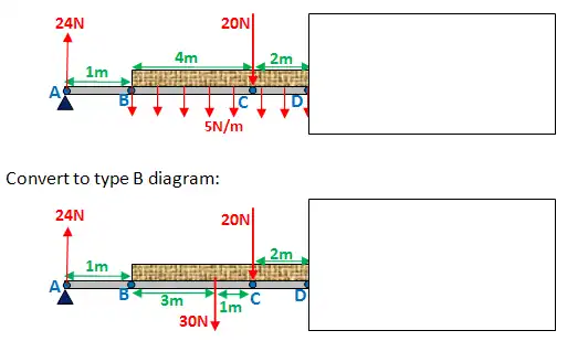 After identifying the key points, you want to work out the values of R1 and R2. You now need to convert to a type B diagram, as shown below. Notice the 30N force acts right in the middle between points B and D.