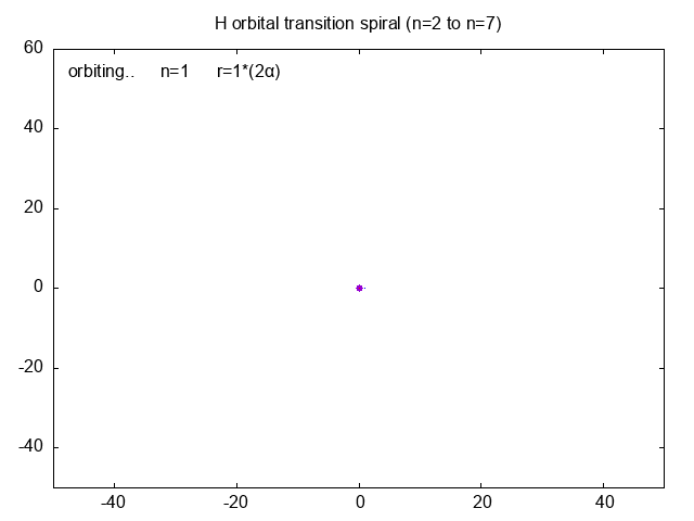 - Electron transition between atomic orbitals is treated semi-classically as a gravitational orbit, the electron following a spiral path between orbitals, quantization (n-levels; n = 1, 2, 3 ...) appearing naturally at fixed intervals of pi (2π, 8/3π, 3π ...) along the spiral path. The Bohr model emerges from this gravitational spiral, thus the transition process itself combines the gravitational Bohr model with the electric wave-state Schrodinger equation. Bohr and Schrodinger are therefore complementary, each representing a different particle state (the model uses the 2 states, wave and point, instead of 2 forces). The supposed weakness of gravity is statistical rather than physical (at the Planck scale it is equivalent to the strong force).