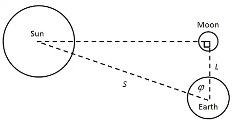 Half Moon Aristarchus began with the premise that, during a half moon, the moon forms a right triangle with the Sun and Earth. By observing the angle between the Sun and Moon, φ, the ratio of the distances to the Sun and Moon could be deduced using a form of trigonometry.