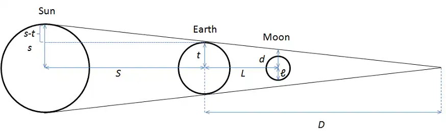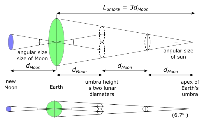 Let be the diameter of the umbra, which we estimate to be equal to the radius of Earth and also twice the diameter of the Moon, but since the diameter of the Moon is twice its radius, we have: