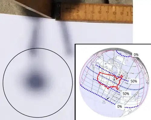 - ↑ It is almost entirely penumbra because the ball was held so that the angular size of the ball nearly equaled the angular size of the Sun. If the two angular sizes are equal, the umbra is essentially reduced to the area of a single point.