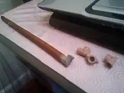 - In a hardwood bead or branch segment you can make a quarter-inch crater, to a depth of 3/16"/4 mm., with a narrower mid-channel as above, or narrowing down further leading to a tightly inserted 3/16" brass tube segment as an exit arm over which the extension tube fits. You can get away with not lining the wood crater by only heating the herb, or burning little herb at low temperature, and by having an upside-down-bottlecap-shaped screen whose side legs stick 1/8" up the side(s) of the cylindrical crater.