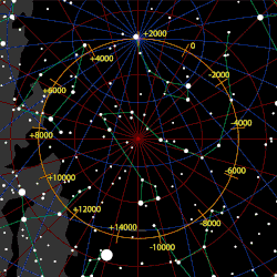 At right is a snapshot of the planetary orbital poles.[15] The field of view is about 30°. The yellow dot in the centre is the Sun's North pole. Off to the side, the orange dot is Jupiter's orbital pole. Clustered around it are the other planets: Mercury in pale blue (closer to the Sun than to Jupiter), "Venus in green, [the] Earth in blue, Mars in red, Saturn in violet, Uranus in grey [partly underneath Earth] and Neptune in lavender. Dwarf planet Pluto is the dotless cross off in Cepheus."[14]