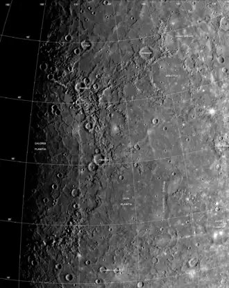 - ↑ 19.0 19.1 Spudis, P. D. (2001). "The Geological History of Mercury". Workshop on Mercury: Space Environment, Surface, and Interior, Chicago: 100.