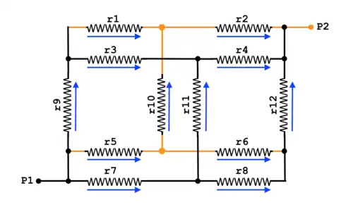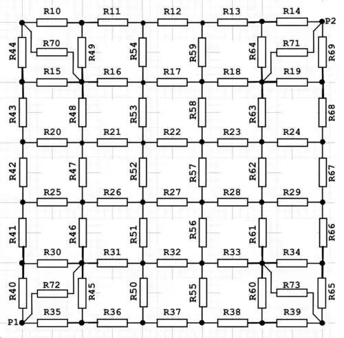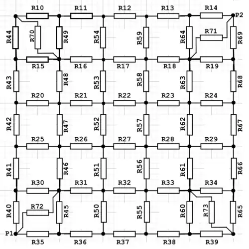 ![]() Diagram has been corrected to show positive direction of current through R70, R73. Original assumptions were that currrent flow through 64 resistors would be from bottom to top or from left to right. Examination of results shows that flow through R70, R73 is from right to left. This is reflected in testing below. Corrected diagram conforms to assumption that all current flow is from bottom towards top or from left to right.