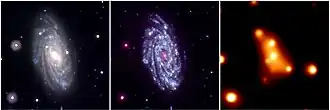 The X-ray/optical composite at right "highlights an ultraluminous X-ray source (ULX) shown in the box. ... The timing and regularity of these outbursts ... make the object one of the best candidates yet for a so-called intermediate-mass black hole. ... Chandra X-ray Observatory observations of this ULX have provided evidence that its X-radiation is produced by a disk of hot gas swirling around a black hole with a mass of about 10,000 suns."[7] "Chandra observed M74 twice: once in June 2001 and again in October 2001. The XMM-Newton satellite also (a European Space Agency mission) observed this object in February 2002 and January 2003."[7]