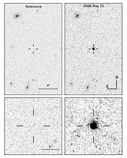 - ↑ Lynn Jenner (4 October 2006). Mug Shots of Supernovas Reveal Two Key Findings. Washington, DC USA: NASA. https://www.nasa.gov/centers/goddard/news/topstory/2006/supernova_mugshot.html. Retrieved 2016-12-01.