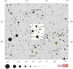 - HR 4731 SIMBAD: "C.D.S. - SIMBAD4 rel 1.218 - 2014.01.22CET03:17:15", "Object query : * alf02 Cru", SIMBAD lists the star's spectral type as "B1V", the otype is IR (2MASS). The infrared citation is 2003yCat.2246....0C. --Marshallsumter (discuss • contribs) 02:30, 22 January 2014 (UTC)