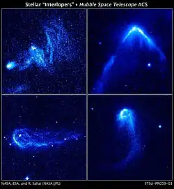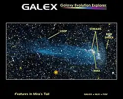 Ultra-violet studies of Mira by NASA's Galaxy Evolution Explorer (Galex) space telescope have revealed that it sheds a trail of material from the outer envelope, leaving a tail 13 light-years in length, formed over tens of thousands of years.[10][11] It is thought that a hot bow-wave of compressed plasma/gas is the cause of the tail; the bow-wave is a result of the interaction of the stellar wind from Mira A with gas in interstellar space, through which Mira is moving at an extremely high speed of 130 kilometres/second (291,000 miles per hour).[12][13] The tail consists of material stripped from the head of the bow-wave, which is also visible in ultra-violet observations. Mira's bow-shock will eventually evolve into a planetary nebula, the form of which will be considerably affected by the motion through the interstellar medium (ISM).[14]