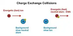 Proton–hydrogen charge-exchange collisions [such as those shown at right] are often the most important process in space plasma because [h]ydrogen is the most abundant constituent of both plasmas and background gases and hydrogen charge-exchange occurs at very high velocities involving little exchange of momentum.