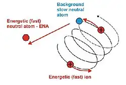 "Energetic neutral atoms (ENA), emitted from the magnetosphere with energies of ∼50 keV, have been measured with solid-state detectors on the IMP 7/8 and ISEE 1 spacecraft. The ENA are produced when singly charged trapped ions collide with the exospheric neutral hydrogen geocorona and the energetic ions are neutralized by charge exchange."[22]
