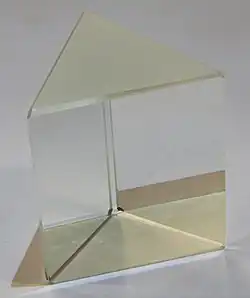 A prism is a transparent optical element with flat, polished surfaces that refract light [over a range of wavelengths]. At least two of the flat surfaces must have an angle [α] between them. The exact angles between the surfaces depend on the application. The traditional geometrical shape is that of a triangular prism with a triangular base and rectangular sides, and in colloquial use "prism" usually refers to this type.