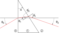 Ray angle deviation and dispersion through a prism can be determined by tracing a sample ray through the element and using Snell's law at each interface. For the prism shown at right, the indicated angles are given by