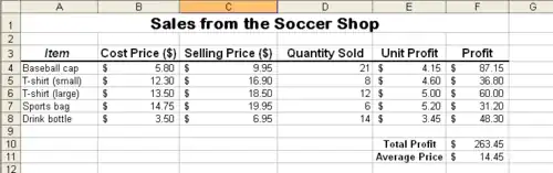 You're in the business of selling some soccer apparel on the weekends while your little brother plays his games! Your challenges is to create the spreadsheet displayed in the picture with the data provided below.