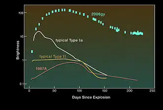 - ↑ N. Smith (7 May 2007). Chandra X-ray Image of SN 2006gy. Cambridge, Massachusetts, USA: Harvard-Smithsonian Center for Astrophysics. http://chandra.harvard.edu/photo/2007/sn2006gy/more.html#sn2006gy_xray. Retrieved 2016-12-11.
