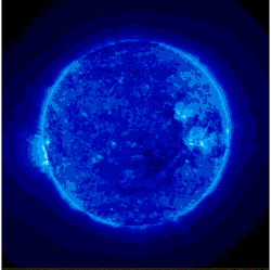 The second image at right is "taken on December 16, 2008 during sunspot-minimum conditions, was created by isolating the light produced at a wavelength of 195 Angstroms (19.5 nanometers) by the ion Fe XII. By selecting the light from only one spectral line, a spectroheliograph works like a high-precision light filter and lets astronomers map, or image, a distant object in the light from a single spectral line. This information can be used to map the temperature and density changes in the gas."[33]