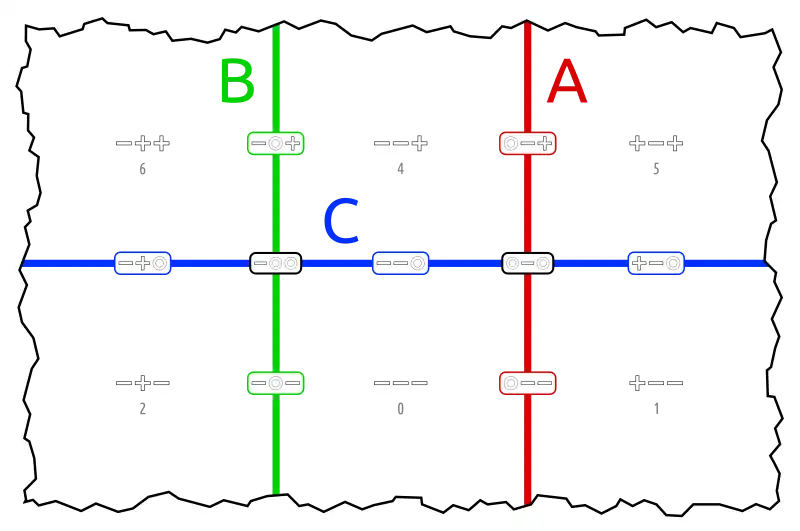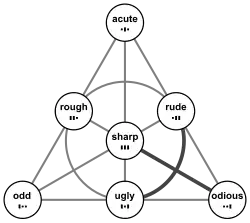 • foible      The foibles are seven properties, that correspond to the vertices of a Fano plane.   (see here for an overview)