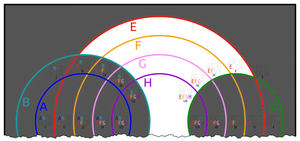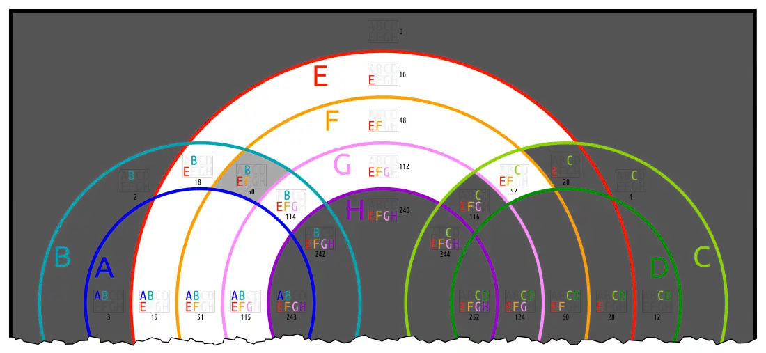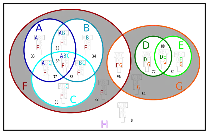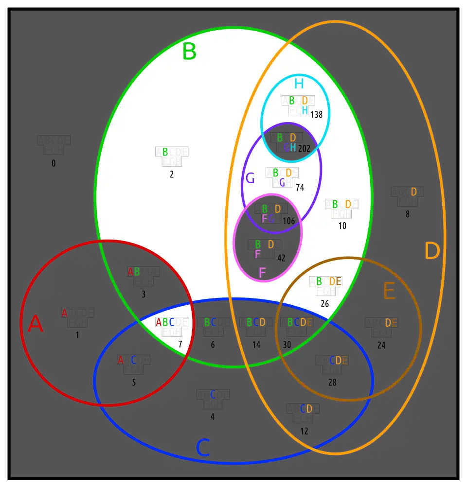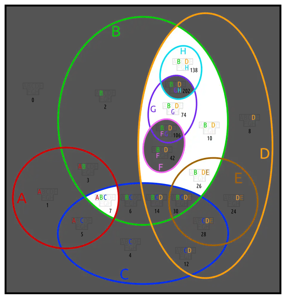 This is an 8-ary Boolean function. It contains the usual kind of information about A...G, as well as the fact that there is nothing outside of H.