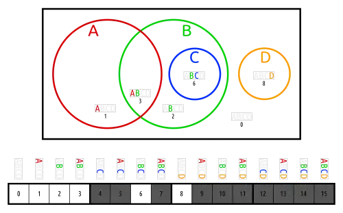 Light gray areas of the Euler diagram are empty, i.e. the corresponding fields in the truth table are false. The Euler diagram could not be drawn without these gap cells, because each border can belong to only one set, and crossing it corresponds to a change of one bit.