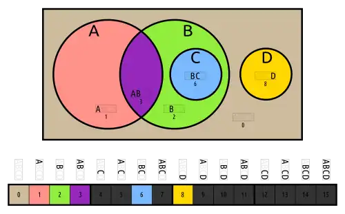 The gray/white truth tables on the right are always minterms, and represent the position of the bundle in relation to every other set, i.e. inside or outside of it.