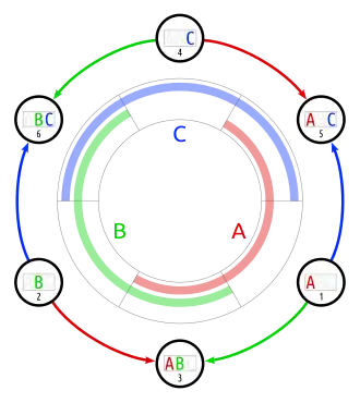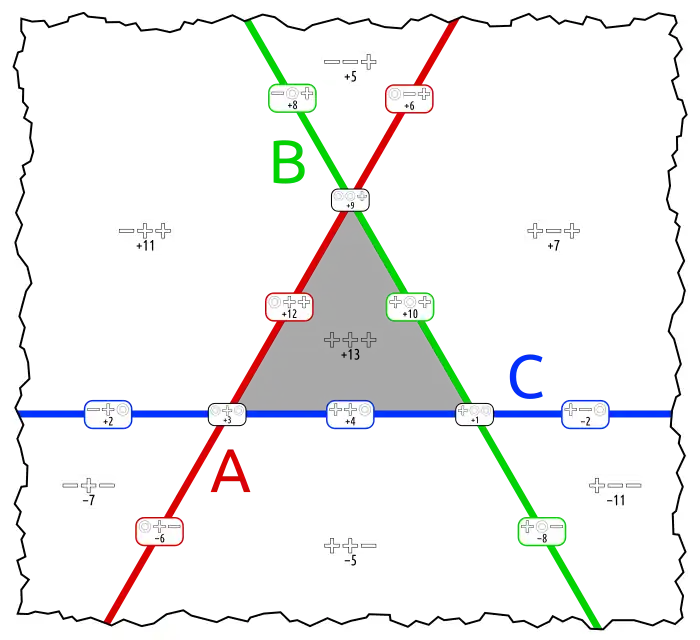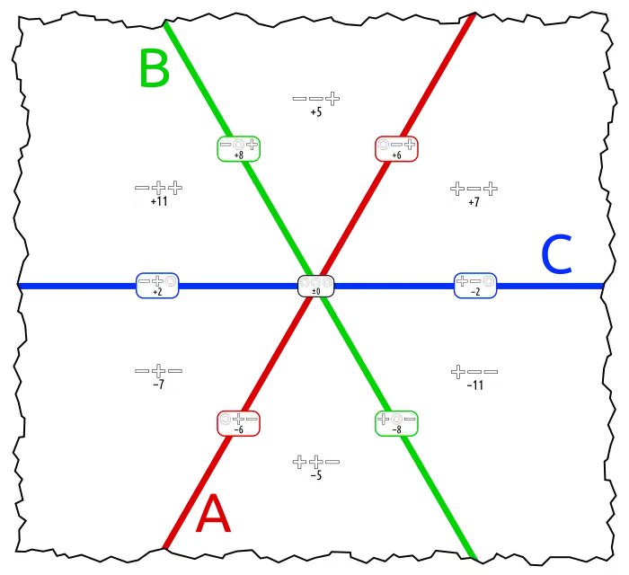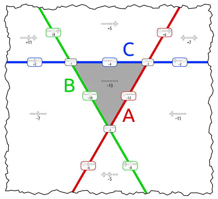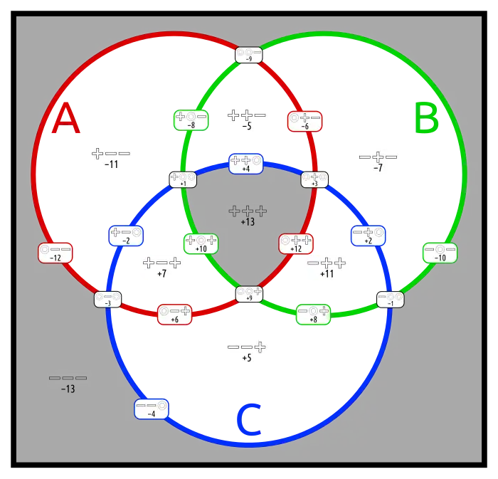 This is the complement of the Boolean function that states the three arguments to be equal. This function can be represented in one dimension closed to a circle. The corresponding graph is a hexagon. In a 2 dimensions it can reasonably be be shown with two or no gapspots. (Compare logota, the equivalent with 4 sets.) |