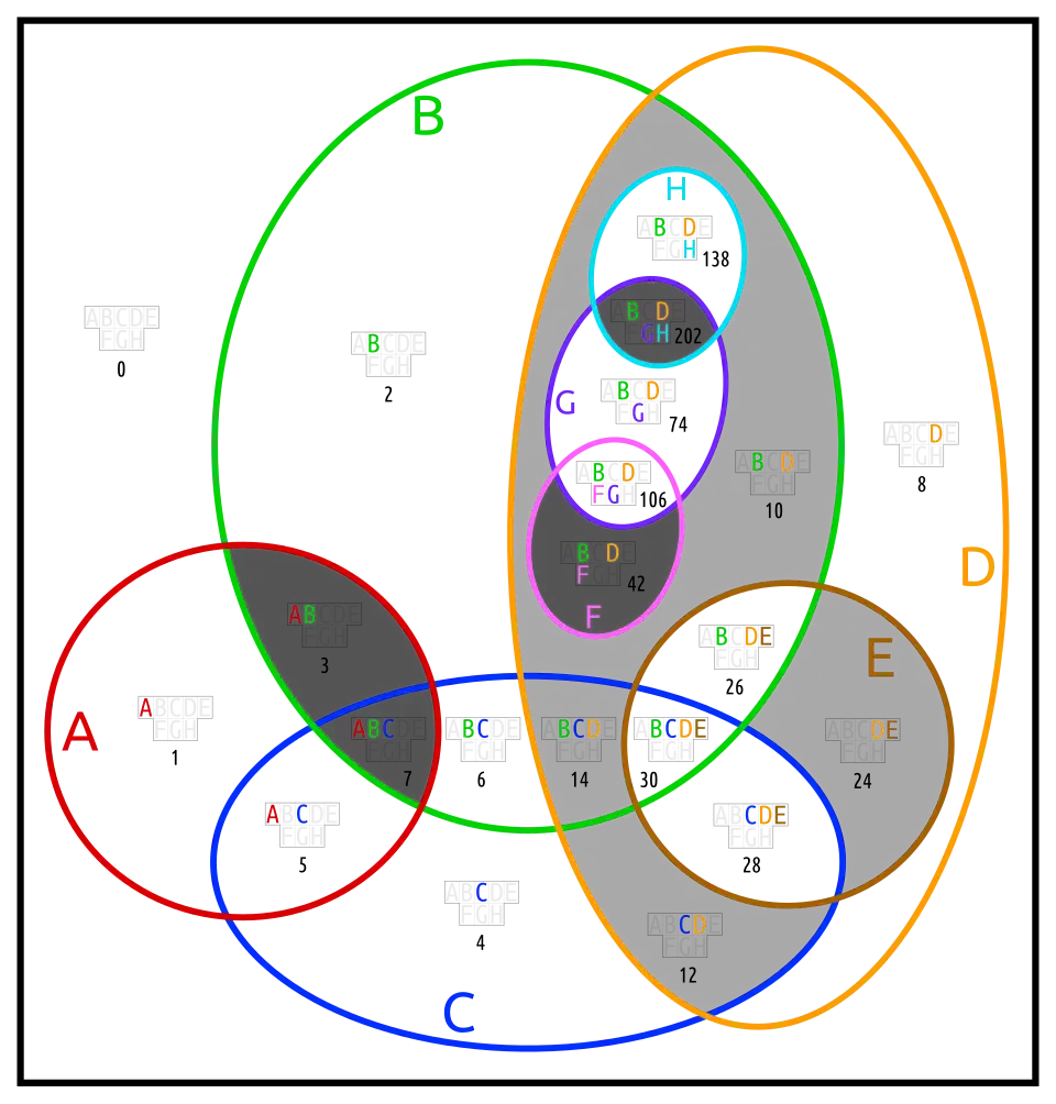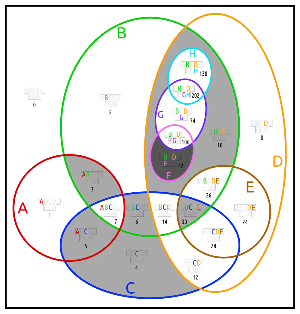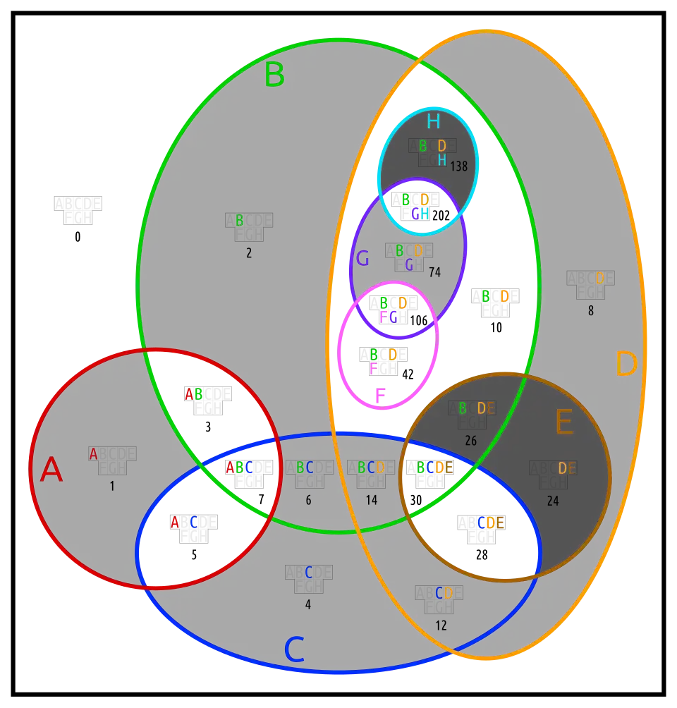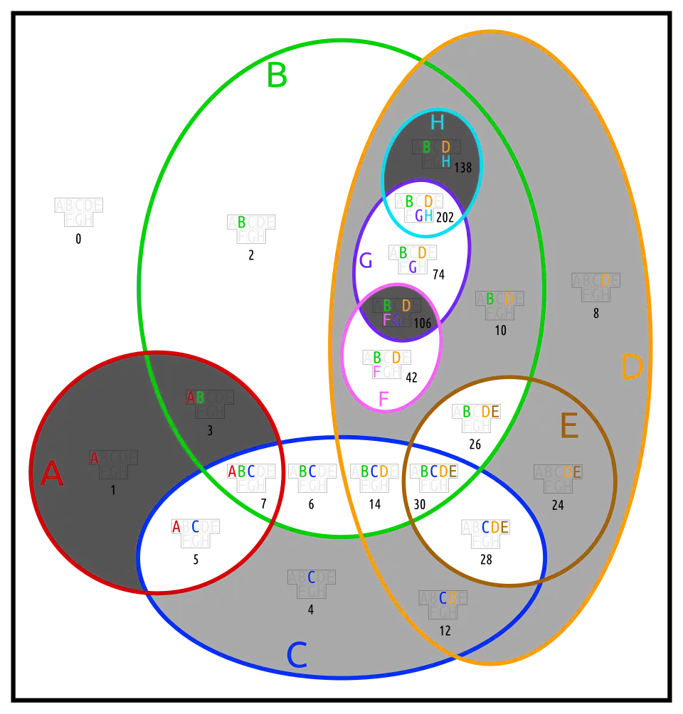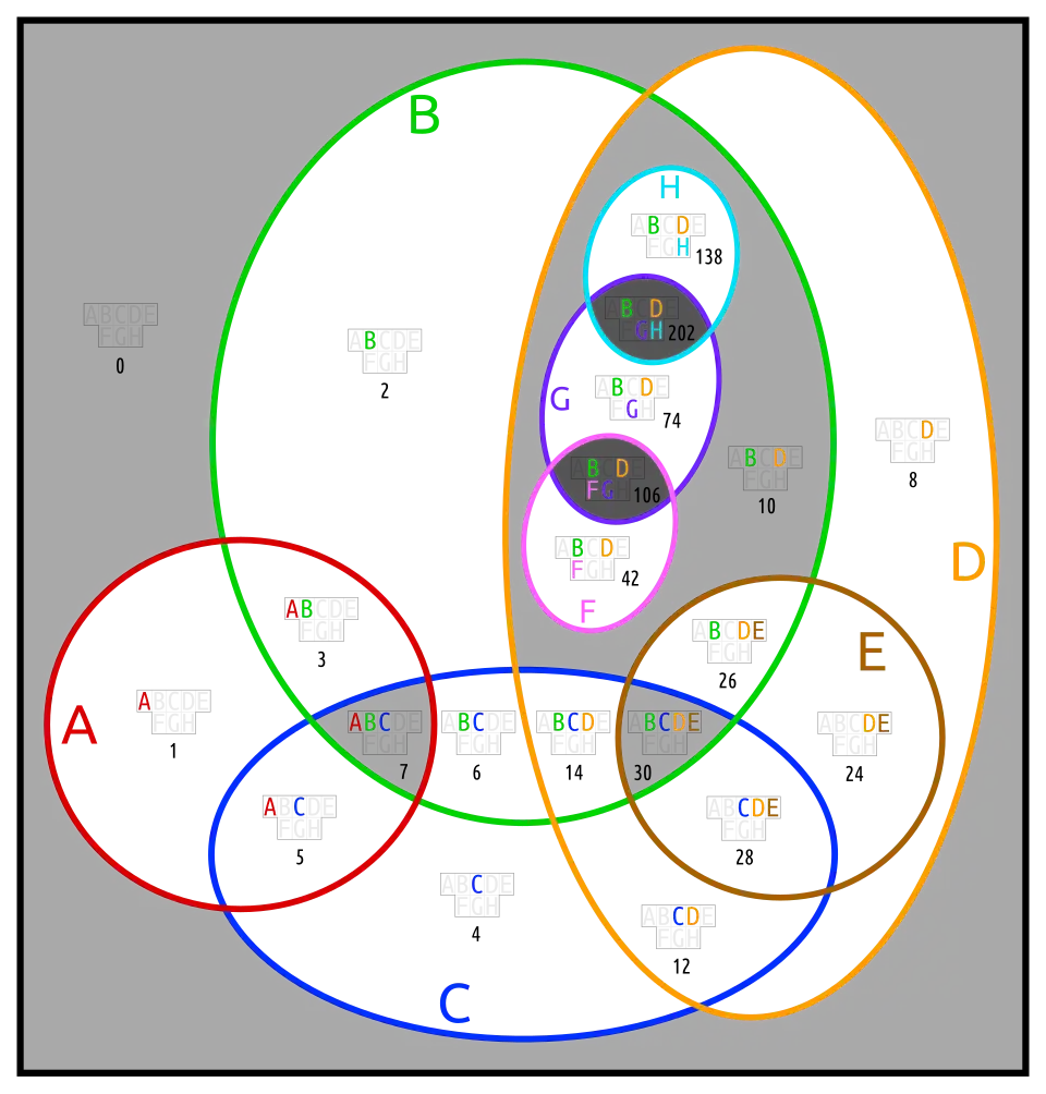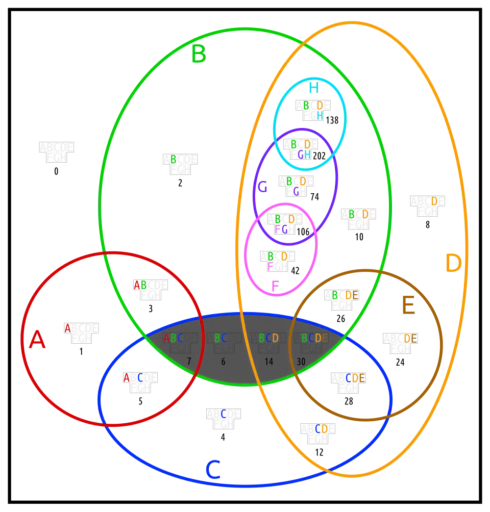 Most Euler diagrams in this section (except doguva) require redrawing. It is shown for only two of them. Blightless means, that no two sets are equal or complements, and that no set is empty or the universe.