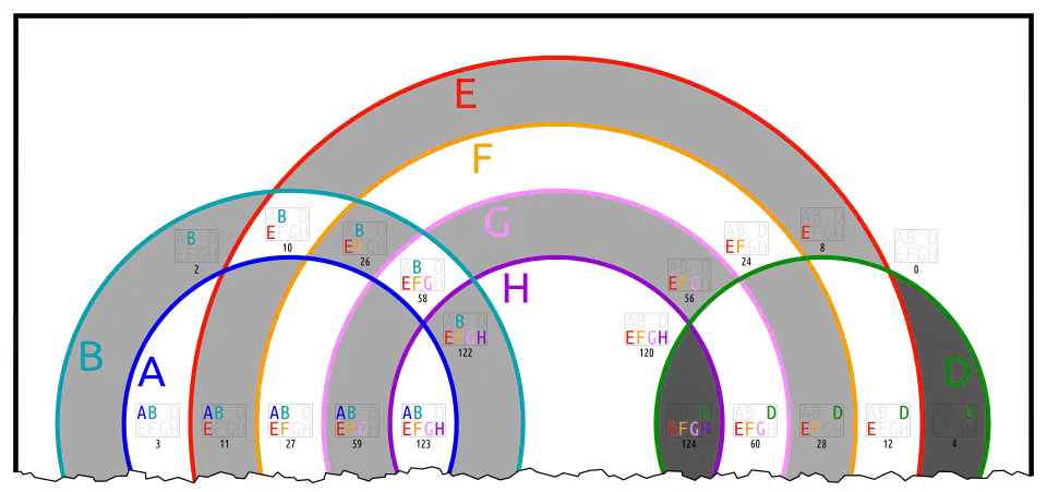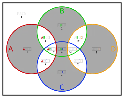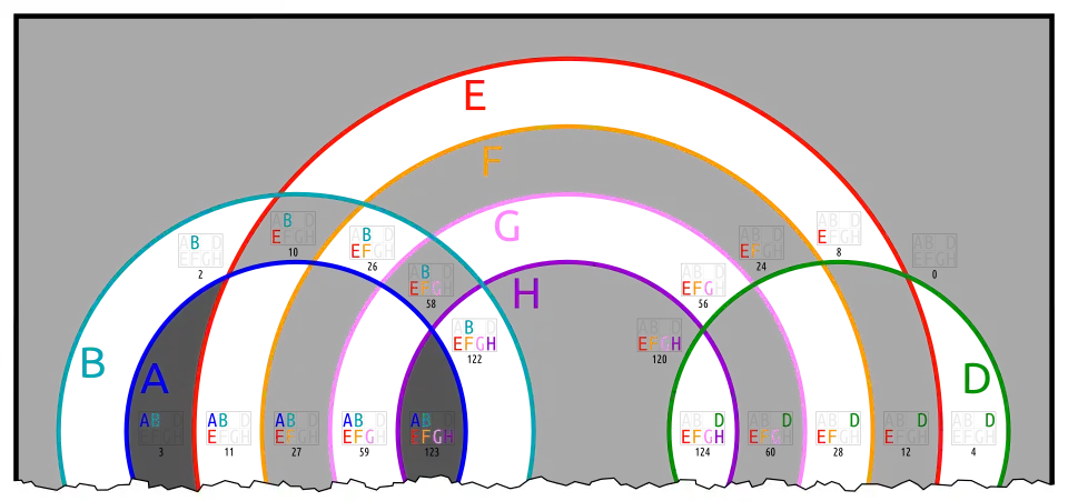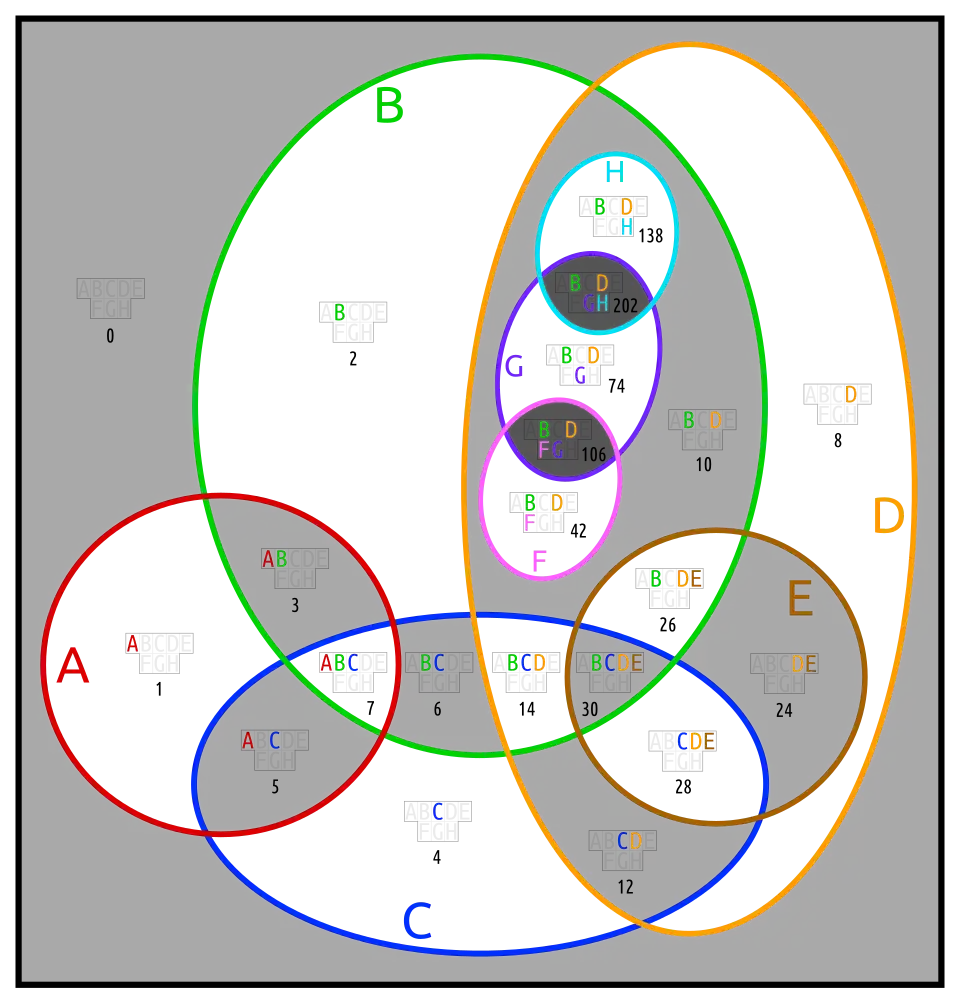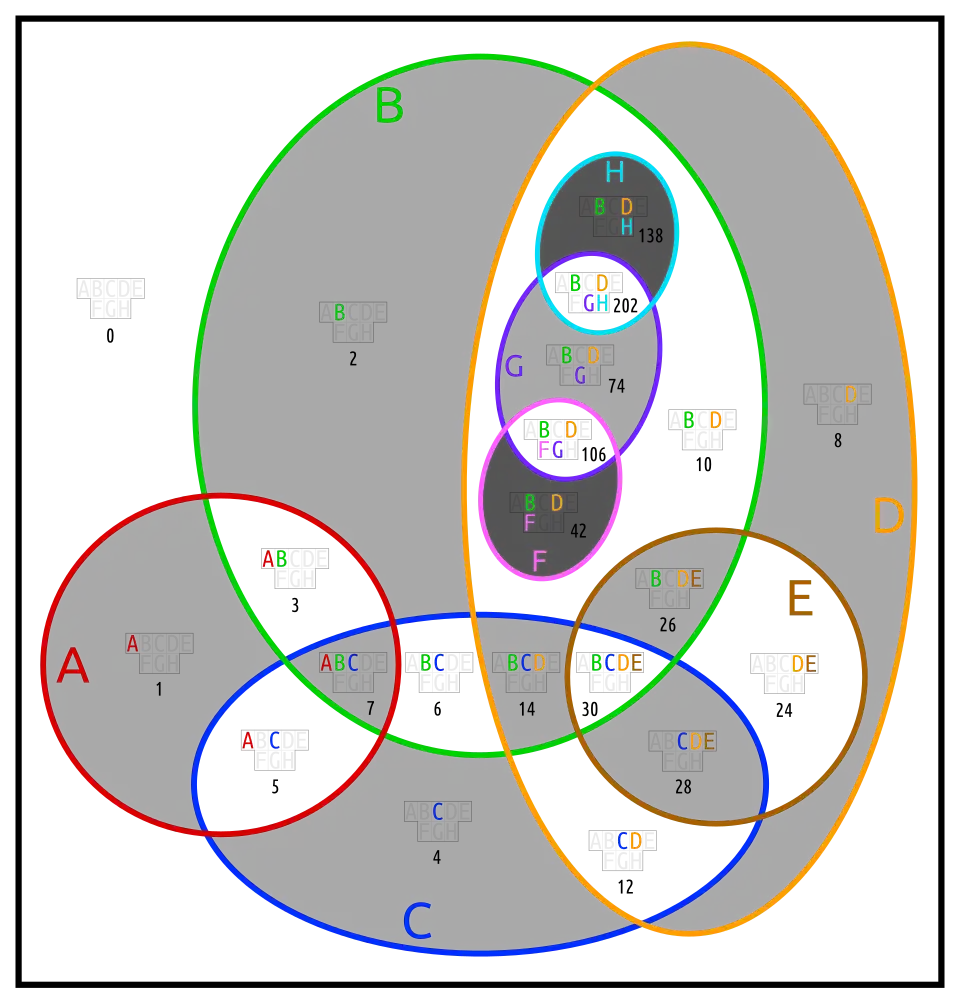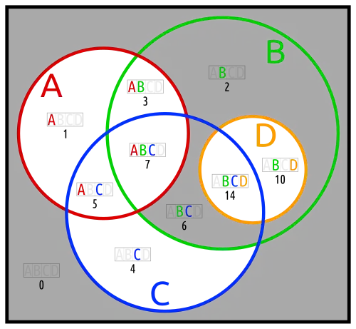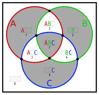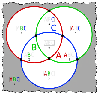Below are different Euler diagrams of the 3-ary Boolean function .
