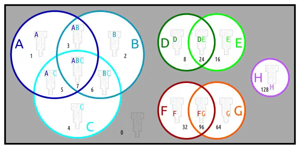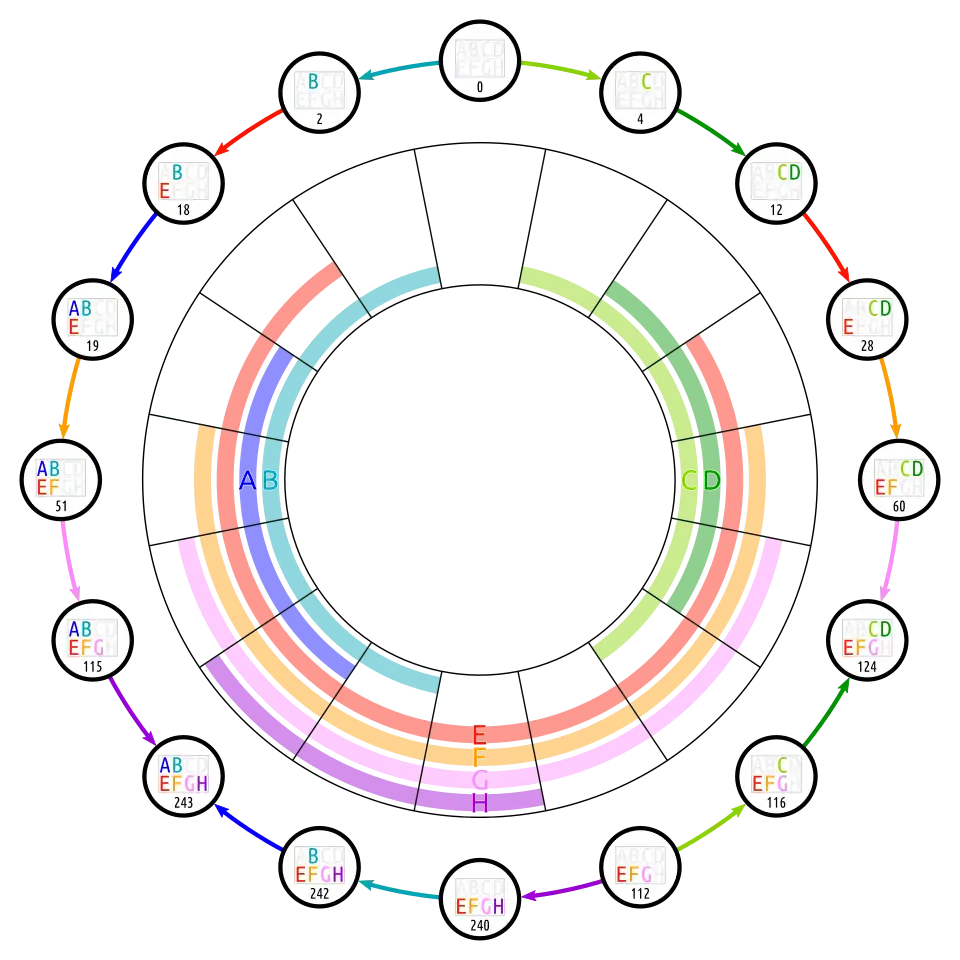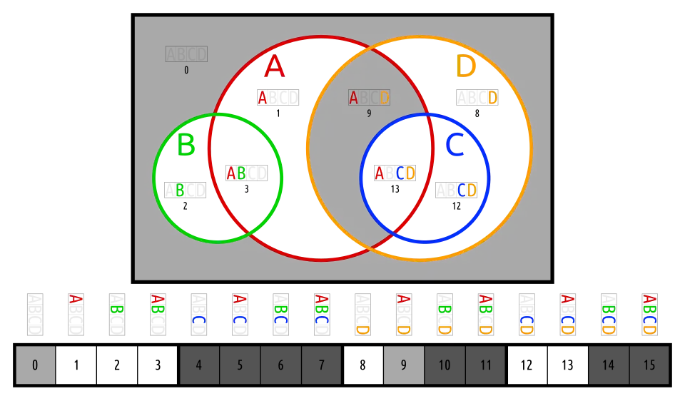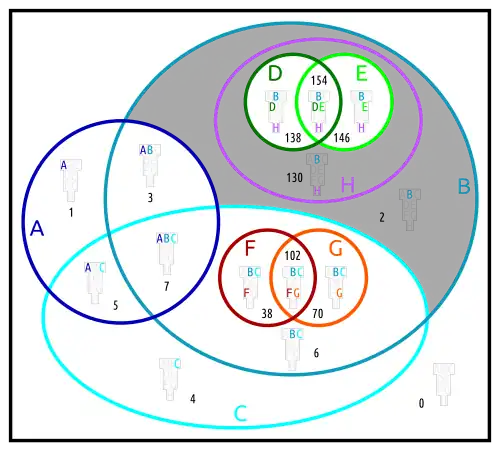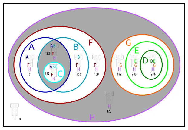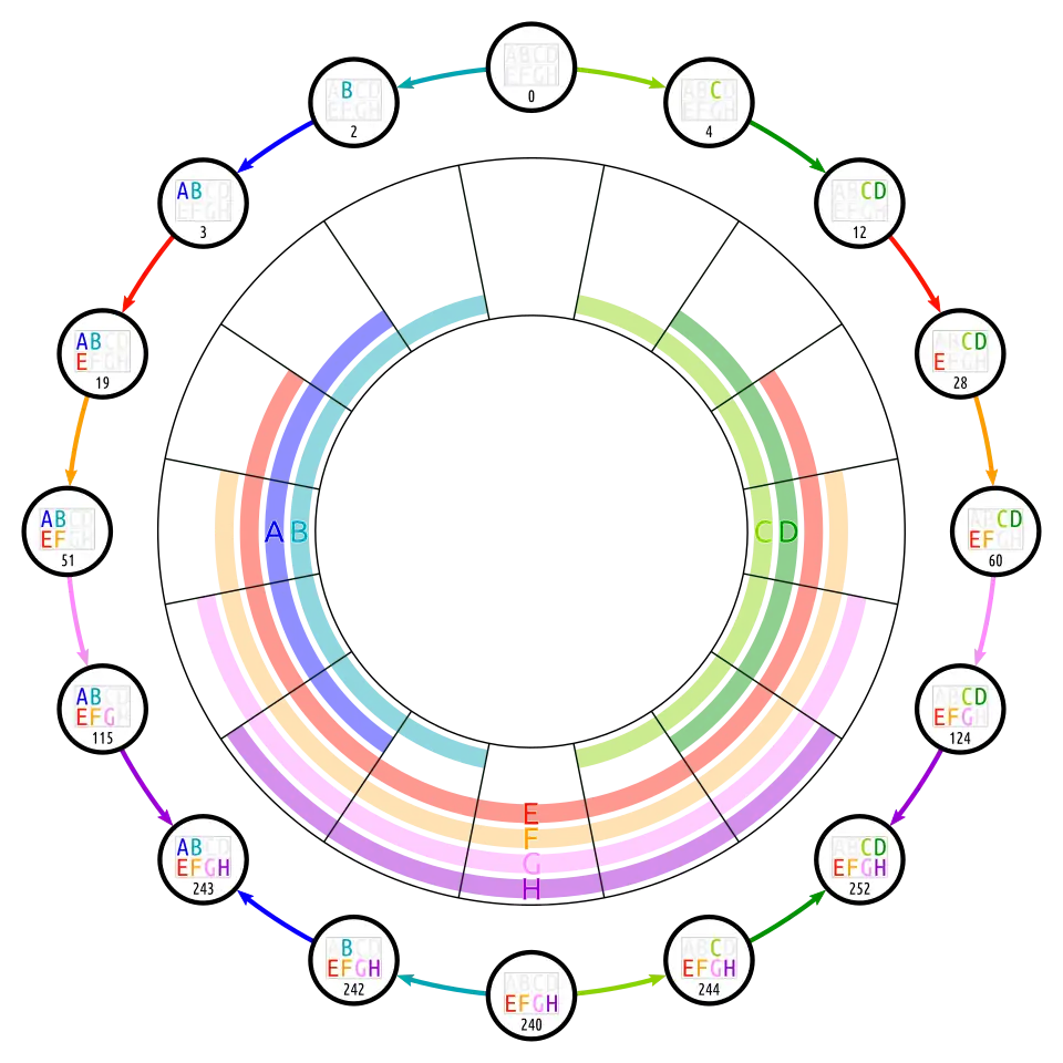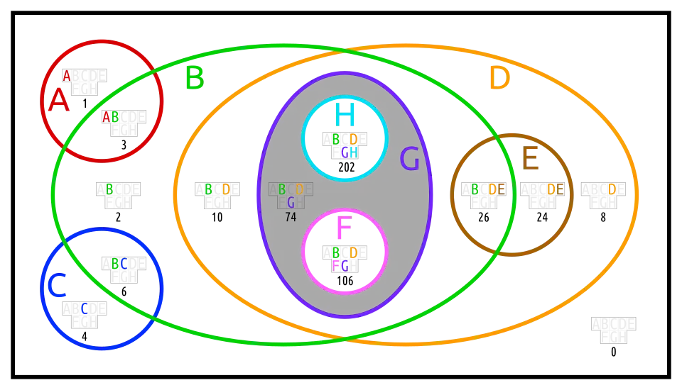 Below are different Euler diagrams of the 3-ary Boolean function .