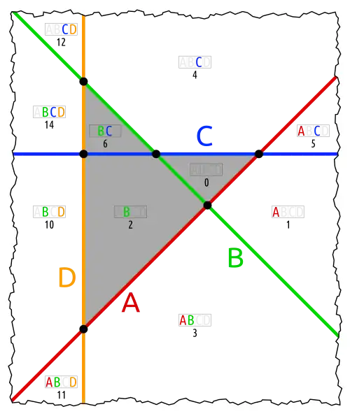 In a 2-dimensional representation the borders intersect in a single point. (Compare foravo, the equivalent with 3 sets.)