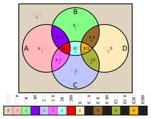 This Boolean function was initially found by adding another intersection to the inflated function barogi (shown on the right), creating an Euler diagram with an unusual geometry (which could be described as a torus). Each pair of circles overlap, so no two sets are disjoint or in a subset relationship. It turned out to be difficult to verify, that this function does not require gapspots.