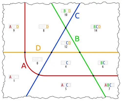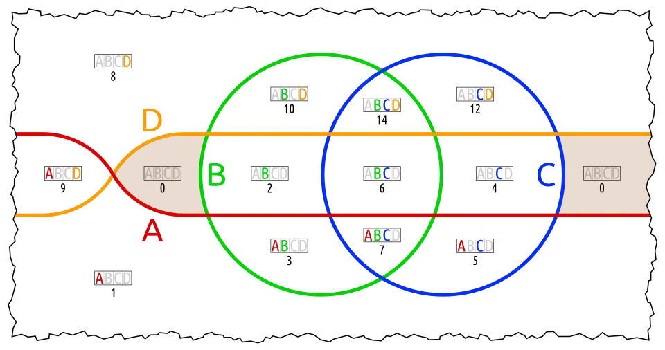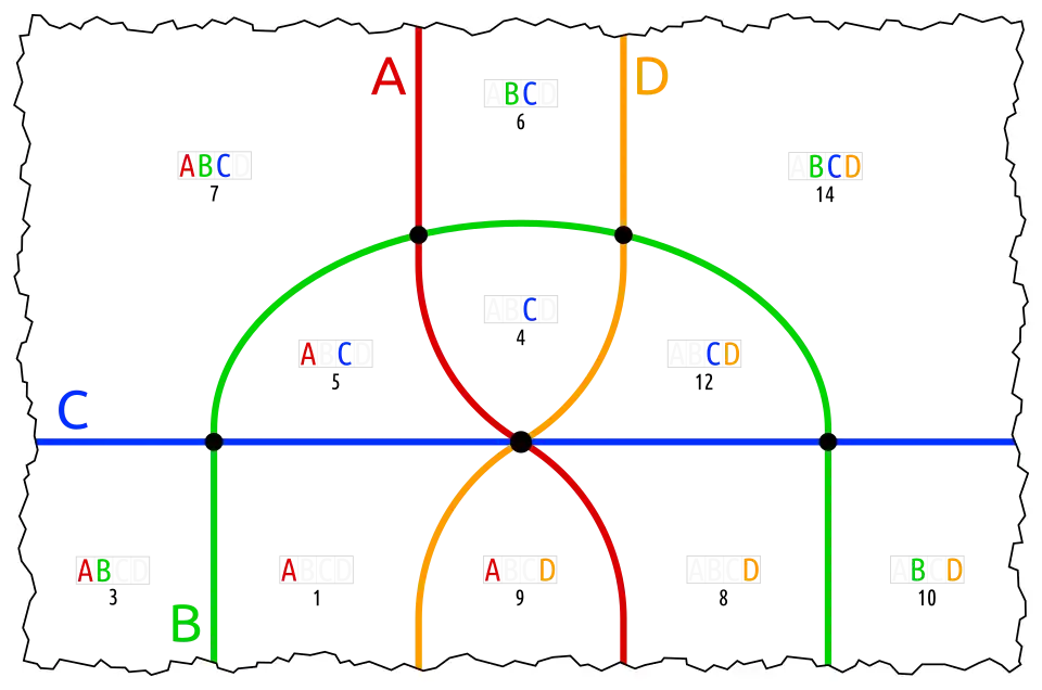 Spot 3 is on its own an octant of the lower 3-split. Removing it causes this 3-split to disappear. The resulting function farofe still has the other one, and thus also requires an Euler diagram with 3 dimensions. Removing spot 2 as well, causes also the upper 3-split to lose its bottom front octant, so the resulting function niliko has a 2-dimensional Euler diagram. Removing spots 0 and 2 creates the new gapspot 11, which is on its own an octant of the new 3-split ABD. Theoretically the resulting function rudege has a 3D diagram, but no properties are lost in the 2D projection shown.